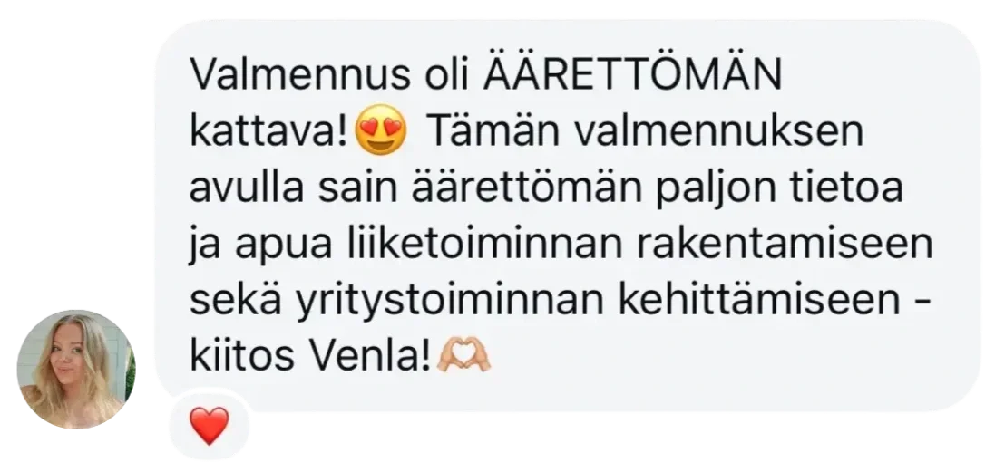 Henkilökohtaisessa valmennuksessa opetan sinua tuottamaan strategista, viestinnällisesti vakuuttavaa ja visuaalisesti näyttävää markkinointia, joka saa palvelusi näkyväksi ja halutuksi.